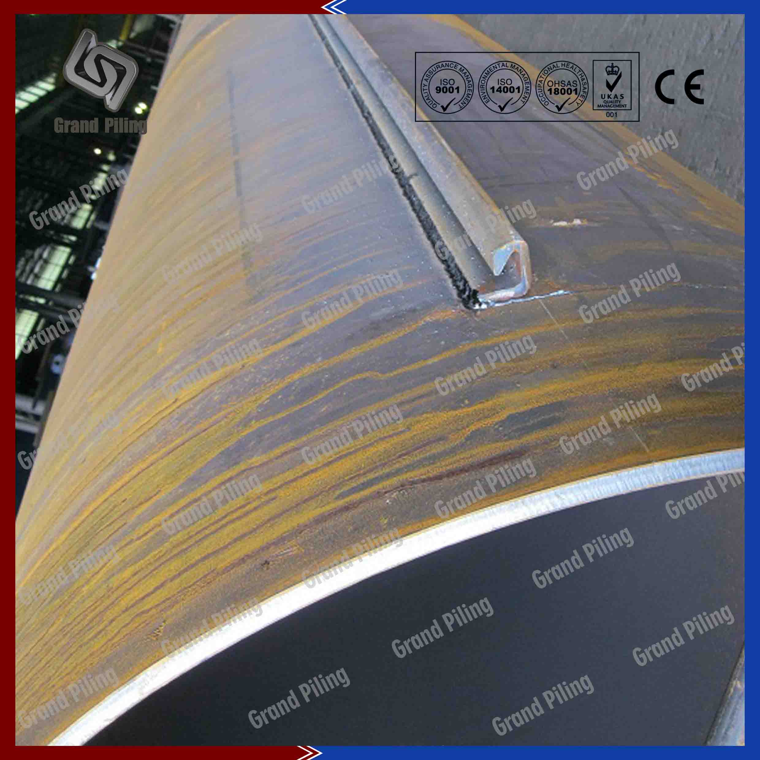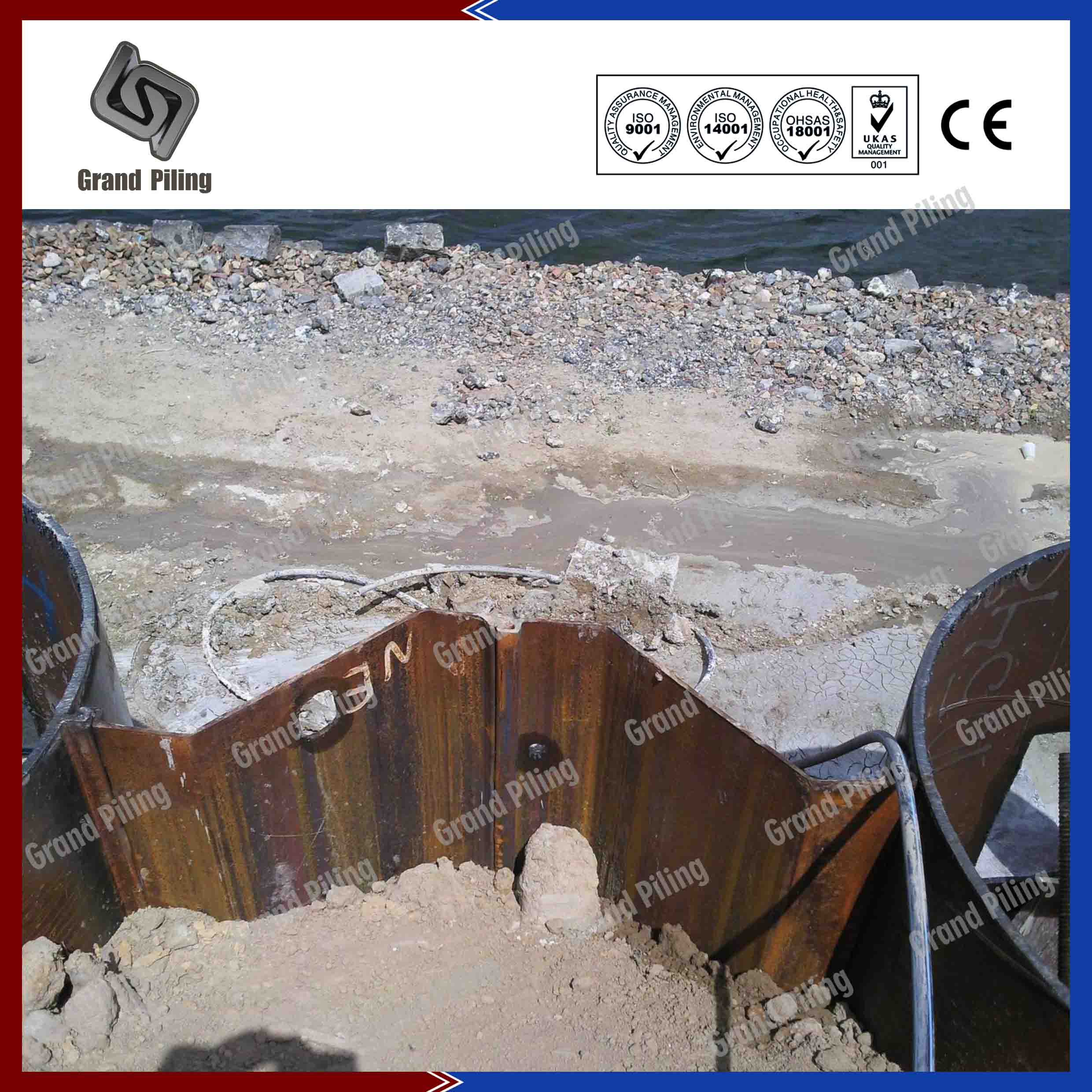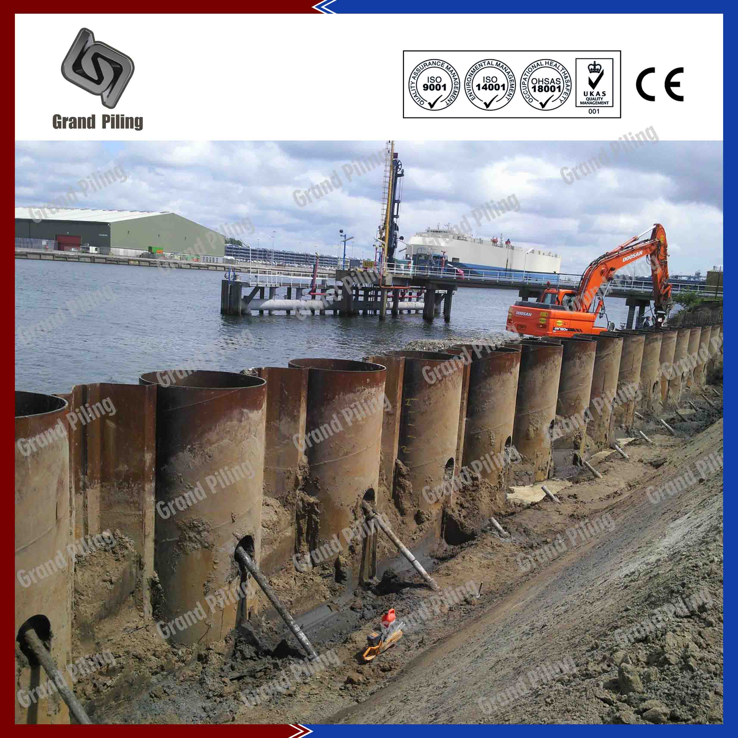 This is a combbined wall system.A pairs of AZ sheet piles are welded between two pipes,connected by C9 interlocks. The soils are very soft,which mean the wall must have a very high modulus of section.Finally clients accept Grand Piling’s Combined systems. 1500x18 pipes piles are used S355 steel grade,over 2500 tons. Length from 25 to 35m.C9 interlocks are also supplied and welded by Grand Piling.